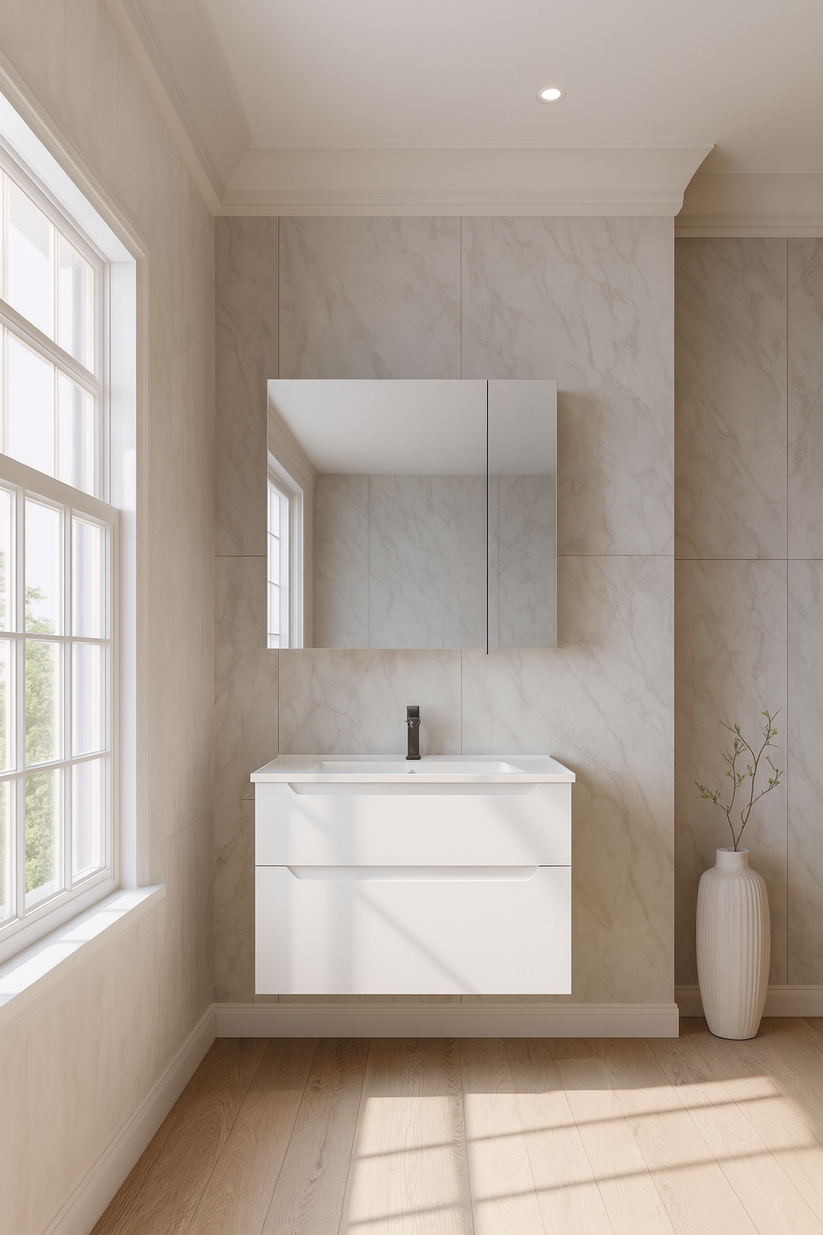 ORKA MESSINA 80/100 Schubladen Set (Waschbeckenunterschrank, Waschbecken,Spiegelschrank) Matt Weiß/Matt Eiche