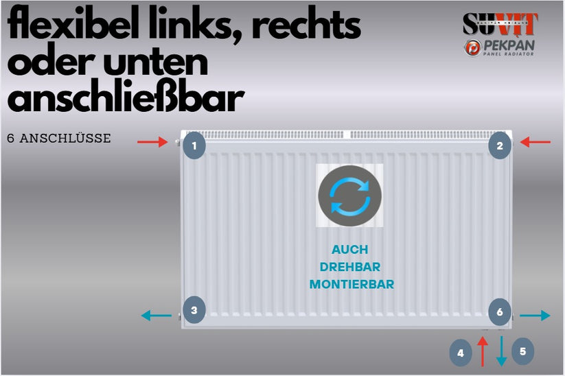 Flexible Montage & 6 Anschlüsse – 6-fach Anschluss (1/2" Innengewinde) für links, rechts oder unten. Inkl. drehbare Anschlüsse, ideal für Boden- oder Wandmontage, einfache Anpassung an jede Raumkonfiguration.